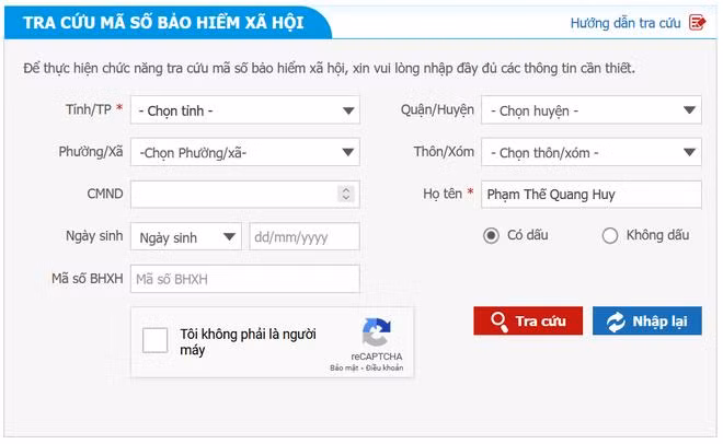 - Ngoài ra, bạn có thể truy cập vào trang web của Bảo hiểm Xã hội Việt Nam tại đây , điền thông tin cá nhân vào các khung trống (chỉ cần điền những khung nào có dấu *), đánh dấu vào tùy chọn "Tôi không phải là người máy" rồi nhấn nút "Tra cứu".
