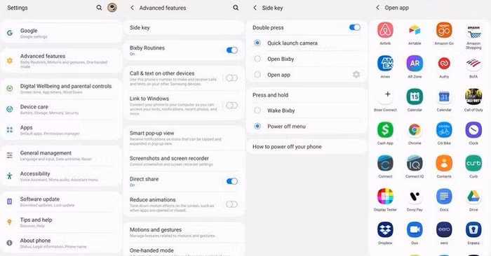 Với thao tác bấm đúp nút cạnh bên, người dùng có thể lựa chọn dùng để mở nhanh camera, hoặc để mở Bixby Home, hoặc để mở một app nào đó theo tùy chọn (ngoại trừ để gọi trợ lý ảo Google Assistant).