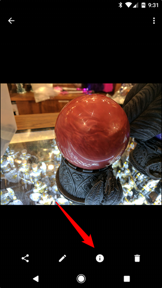 Khi ứng dụng đã sẵn sàng, hãy mở một bức ảnh. Ở dưới đáy màn hình bạn sẽ thấy 4 lựa chọn: chia sẻ, chỉnh sửa, thông tin và xóa. Hãy nhấp vào mục thông tin (biểu tượng chữ "i" trong hình tròn).