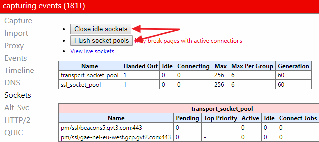 Cuối cùng, bạn nhấn lần lượt các nút Close idle sockets và Flush socket pools. Việc này sẽ đóng tất cả các socket của trình duyệt.