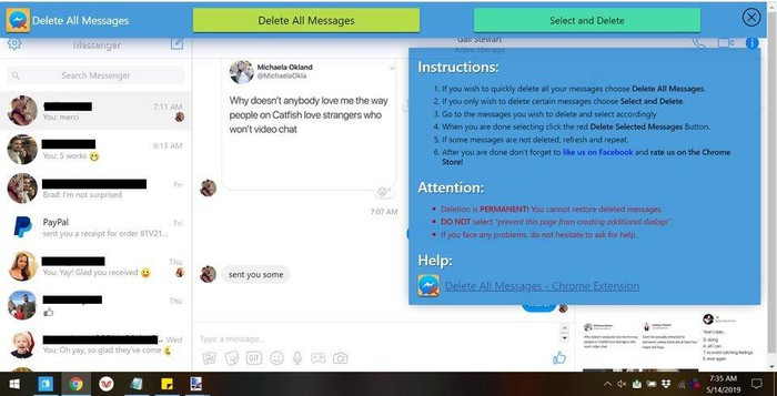 Nếu muốn xóa tất cả tin nhắn Facebook Messenger vì lý do nào đó, bạn có thể thực hiện dễ dàng, cụ thể là nhờ tiện ích mở rộng Delete All Messages của trình duyệt Google Chrome. Dưới đây là hướng dẫn xóa hàng loạt tin nhắn Facebook: