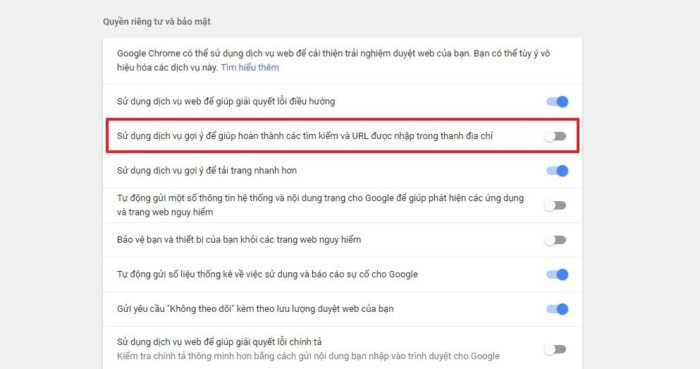 - Trong phần Privacy and security (Quyền riêng tư và bảo mật), bạn chuyển công tắt tại mục Use a prediction service to help complete searches and URLs typed in the address bar (Sử dụng dịch vụ gợi ý để giúp hoàn thành các tìm kiếm và URL được nhập trong thanh địa chỉ) sang vị trí Off (Tắt) để vô hiệu hóa chức năng gợi ý và tự động điền trên thanh địa chỉ của Chrome.