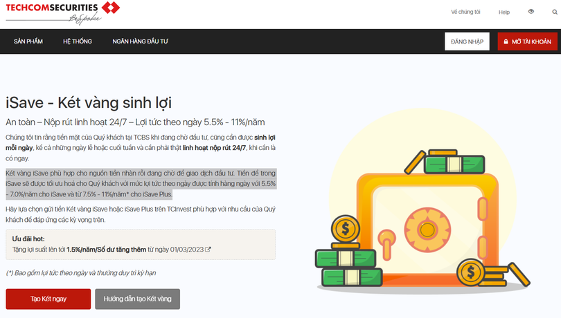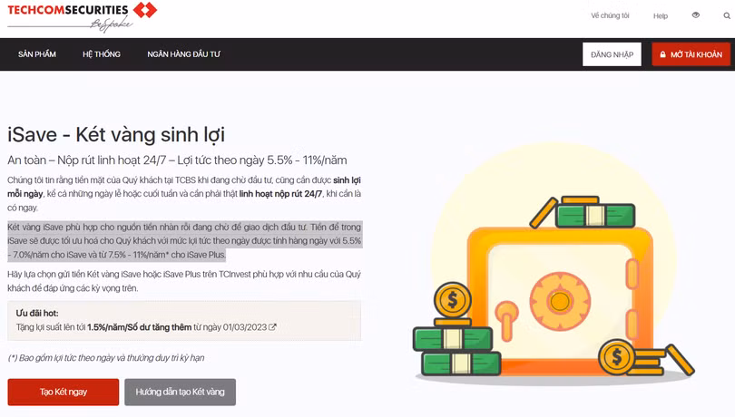 Theo giới thiệu của TCBS, chương trình ‘iSave – Két vàng sinh lợi’ cho phép khách hàng nộp rút linh hoạt 24/7, với lợi tức theo ngày lên tới 5,5% - 11%/năm.
