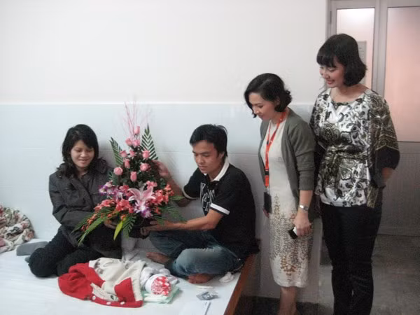Đại diện Jetstar Pacific thăm và tặng hoa cho chị Nguyễn Thị Lập sinh bé trai trên máy bay năm 2011