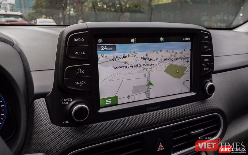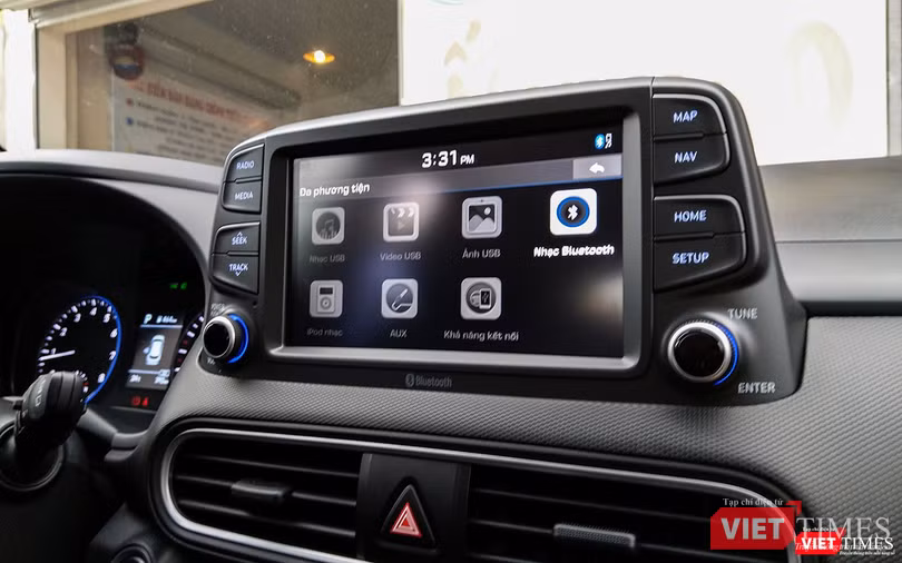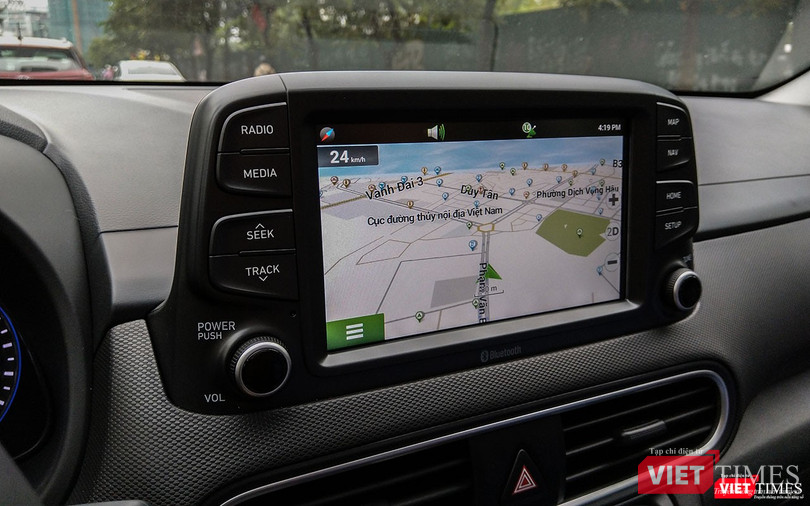 Kona cũng là mẫu xe đầu tiên của Hyundai chuyển sang sử dụng kiểu màn hình nổi trên cao vốn đang là xu hướng của các hãng xe hiện nay. Tuy nhiên, màn hình có kích thước 8 inch lại hơi thô và vẫn còn nhiều nút bấm và núm xoay hai bên nên chưa thật sự tinh tế. Nhựa cứng vẫn là vật liệu chiếm ưu thế khi xây dựng khoang nội thất cho Kona.