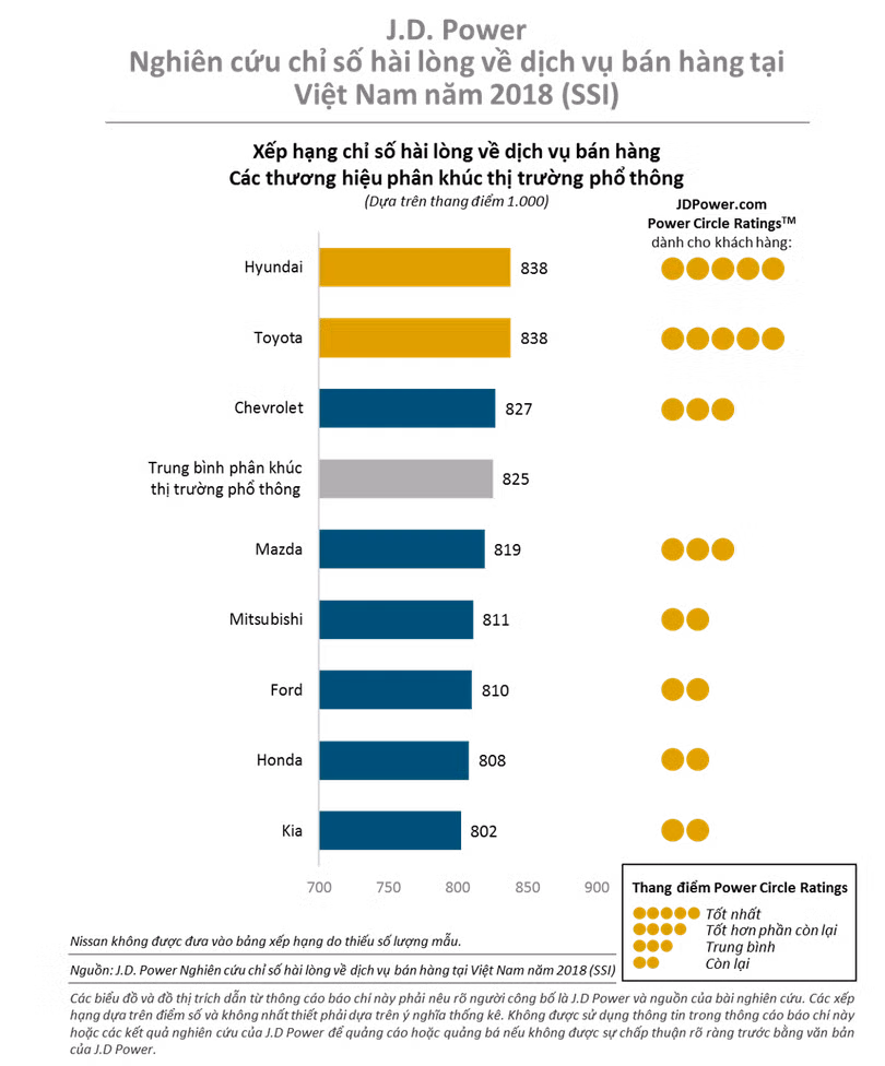 Với 8 thương hiệu ô tô được khảo sát tại Việt Nam năm 2018, cả hai thương hiệu Hyundai và Toyota cùng được xếp hạng cao nhất với số điểm là 838 trên thang điểm tổng 1.000. Đứng ở vị trí thứ 3 là Chevrolet với 827 điểm.