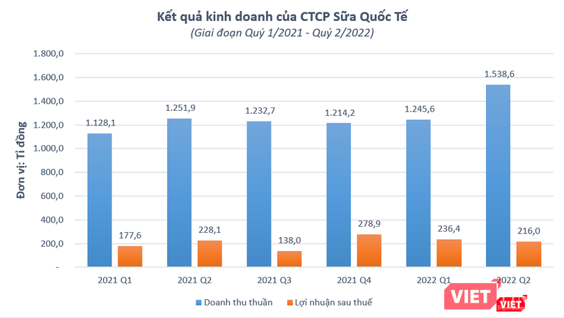 CTCP Sữa Quốc Tế (Mã CK: IDP) vừa công bố kết quả kinh doanh quý 2/2022 với doanh thu thuần đạt 1.538,6 tỉ đồng, tăng 22,8% so với cùng kỳ năm trước. Trừ đi giá vốn hàng bán, công ty này báo lãi gộp 599,6 tỉ đồng, tăng 9% so với cùng kỳ năm 2021.