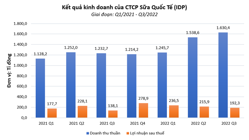 CTCP Sữa Quốc tế (Mã CK: IDP) vừa công bố kết quả kinh doanh quý 3/2022 với doanh thu thuần đạt 1.630,4 tỉ đồng, tăng 32,2% so với quý 3/2021. Trừ đi giá vốn hàng bán, công ty này báo lãi gộp 606 tỉ đồng, tăng 19,7% so với cùng kỳ năm 2021.