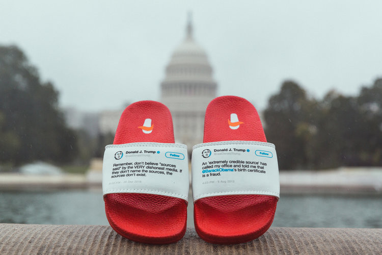 Năm 2013, ông Trump đã tweet để kêu gọi Tổng thống Barack Obama không tấn công Syria và nói rằng nếu tấn công Syria thì lãnh đạo nước Mỹ là ngu ngốc và nước Mỹ chẳng được lợi lộc gì. (thông điệp in trên dép bên trái). Vào tháng 4 năm 2017, Trump đã tấn công Syria và đăng tải dòng tweet chúc mừng chiến dịch (dép bên phải)