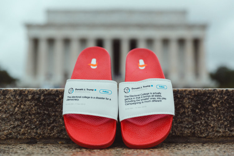 Vào tháng 11 năm 2012, ông Trump đã tweet rằng Đại cử tri đoàn "là một thảm họa cho nền dân chủ" (dép bên trái). Gần 4 năm sau, chỉ vài ngày sau khi giành chiến thắng trong cuộc bầu cử Tổng thống năm 2016, Trump đã gọi Đại cử tri đoàn là "những thiên tài thực sự" (dép bên phải). Đại cử tri đoàn là nhóm 538 người có quyền cao nhất trong việc bầu Tổng thống và Phó Tổng thống Mỹ.