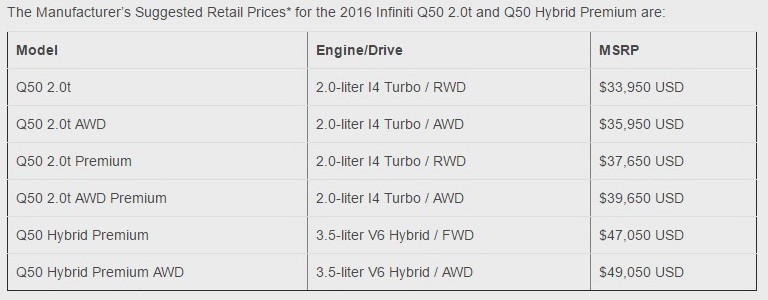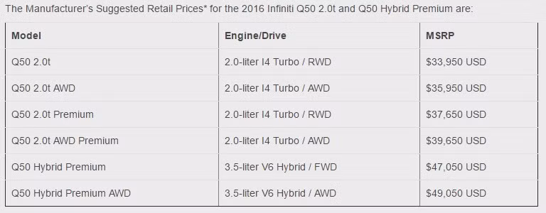 Giá bán niêm yết tại thị trường Mỹ cho các phiên bản động cơ.