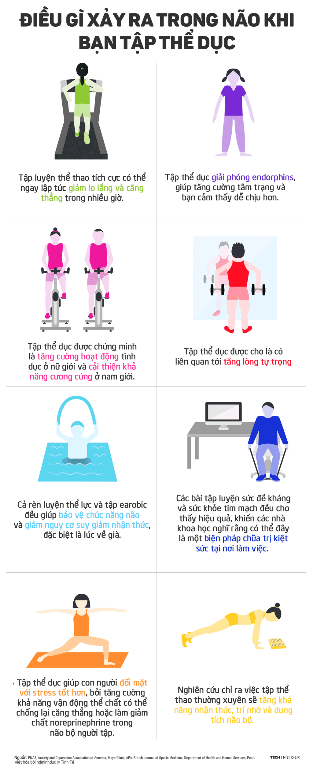 Trước giờ chúng ta thường nghĩ về những lợi ích về mặt sức khỏe thể chất, thể hình của việc luyện tập thể thao nhưng trong Infographic bên dưới sẽ cung cấp một số tác động tích cực của việc tập luyện thể dục thể thao đối với sức khỏe não bộ và thần kinh con người.