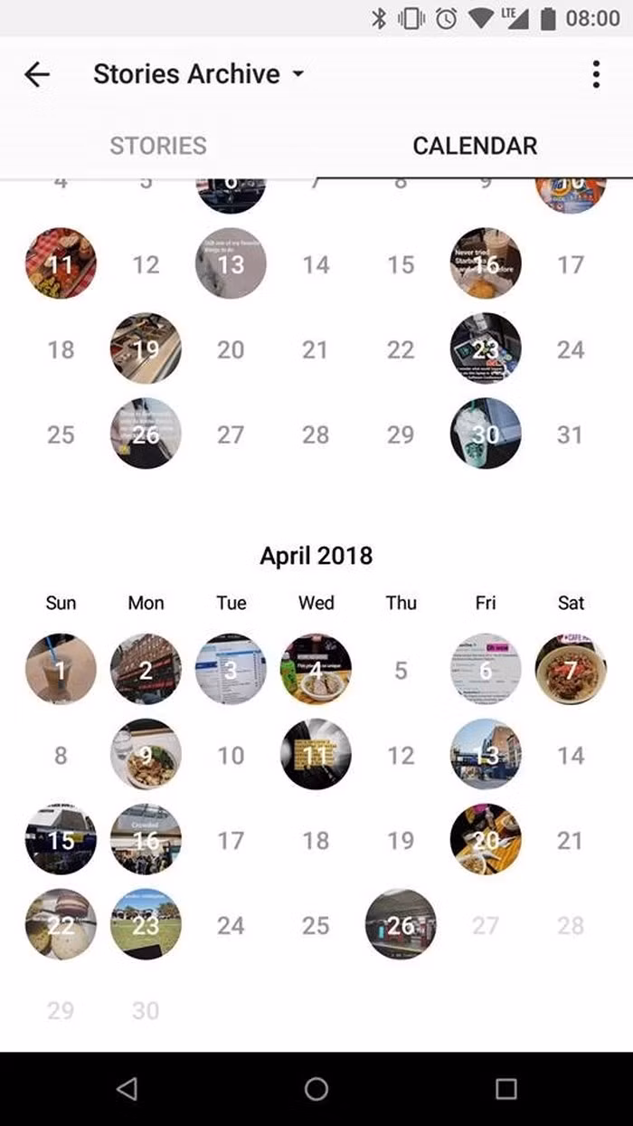 Như ảnh dưới đây, các stories được sắp xếp trên lịch theo thứ tự ngày tháng rõ ràng, cho người dùng một giao diện sạch, trực quan và thông minh hơn. Tuy nhiên câu hỏi đặt ra là Instagram sẽ hiện thị như thế nào nếu người dùng lưu giữ nhiều stories cùng một ngày?