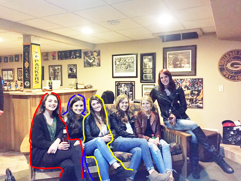 Cả hai cô gái ngồi bên trái ngoài cùng ghế sofa – chính là hai cô gái trong đường kẻ chỉ màu đỏ và xanh – đều mặc quần jean đen, nhưng hình ảnh cho thấy họ mặc quần jean với màu đen khác nhau. Một chân của cô gái chỉ xanh đã lộ ra ở phía dưới (như bạn có thể nhìn thấy giày của cô ấy), và một chân nữa bị khuất phía sau chân cô gái có chỉ đỏ.