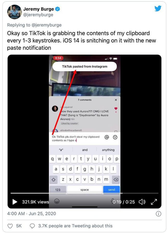 Người dùng đã cập nhật iOS 14 beta phát hiện iPhone của họ liên tục cảnh báo ứng dụng TikTok đang xâm nhập vào clipboard để lấy dữ liệu, hiện tượng này liên tục xảy ra cách nhau mỗi vài giây.