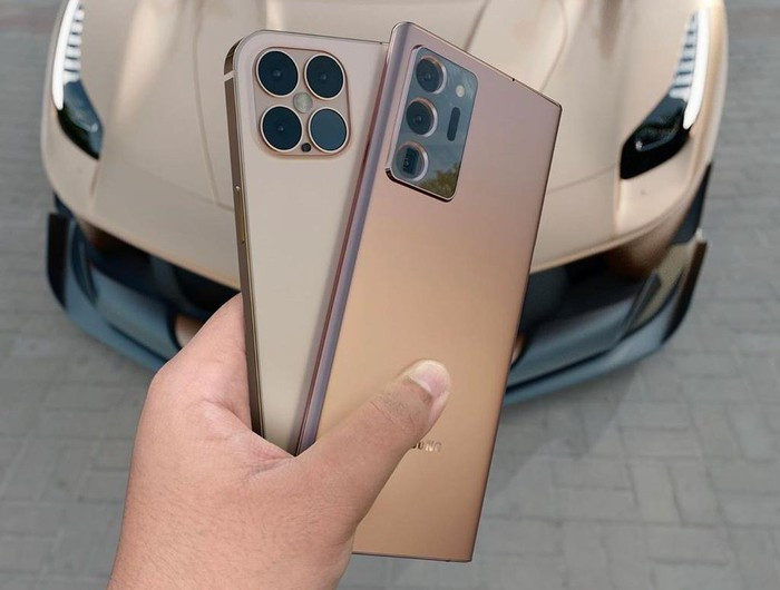 Trong bản dựng này, cả Galaxy Note20 Ultra và iPhone 12 Pro đều có 4 camera sau. Tuy nhiên, smartphone của Samsung có cụm camera hình chữ nhật, to và hầm hố hơn so với iPhone mới. Ảnh: Smazizg.