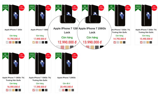 Đây là giá đối máy không có hộp với phụ kiện kèm rời bên ngoài. Hàng fullbox đầy đủ phụ kiện chính hãng thì đắt hơn khoảng 1 triệu đồng. Mức giá của iPhone 7 lock fullbox ngang bằng với iPhone 7 đã qua sử dụng. Vì vậy, khách hàng phải lựa chọn giữa việc mua một chiếc iPhone mới (lock) nhưng có một vài lỗi vặt (do lắp SIM ghép) hay là lấy một chiếc iPhone bản quốc tế (chạy ổn định hơn) nhưng hình thức kém đôi chút. Dù sao, cả 2 lựa chọn nói trên vẫn rẻ hơn được từ 4-5 triệu đồng nếu so với hàng quốc tế mới phân phối chính hãng.