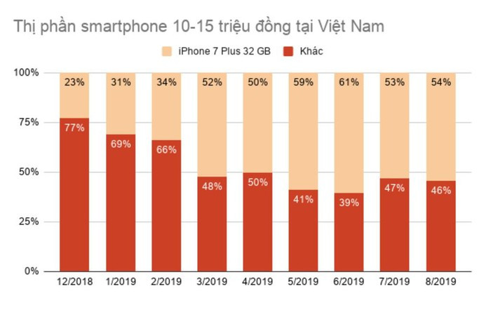 Ở phân khúc giá từ 10-15 triệu đồng, Apple còn thể hiện rõ sự bành trướng của họ hơn khi chiếm gần 70% thị phần. Điều này có nghĩa 10 người mua smartphone giá 10-15 triệu sẽ có 7 người mua iPhone, trong đó 5 người dùng iPhone 7 Plus 32 GB. Điều này biến model này trở thành chiếc iPhone "quốc dân" khi có 20.000 máy được bán ra trong tháng 8.
