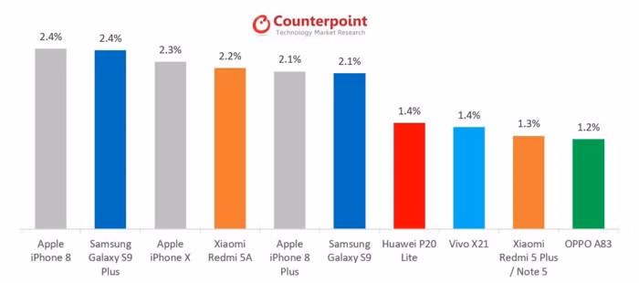 Cụ thể, theo Counterpoint, bản tiêu chuẩn iPhone 8 đã đứng ở đầu bảng xếp hạng với 2,4% thị phần, theo sau là Samsung Galaxy S9 + cũng với 2,4% và iPhone X theo sát với 2,3%, trong khi Xiaomi Redmi 5A đứng vị trí thứ tư với 2,2%.