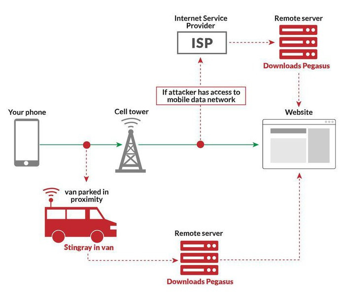 Khi mục tiêu vô tình truy cập vào những trang web có URL bắt đầu từ "http", hacker ngay lập tức chuyển hướng tới một trang web thứ 3, nhanh chóng tải phần mềm Pegasus vào máy của họ. Sau đó, chuyển hướng về trang web ban đầu trong khoảng 1/1.000 giây.