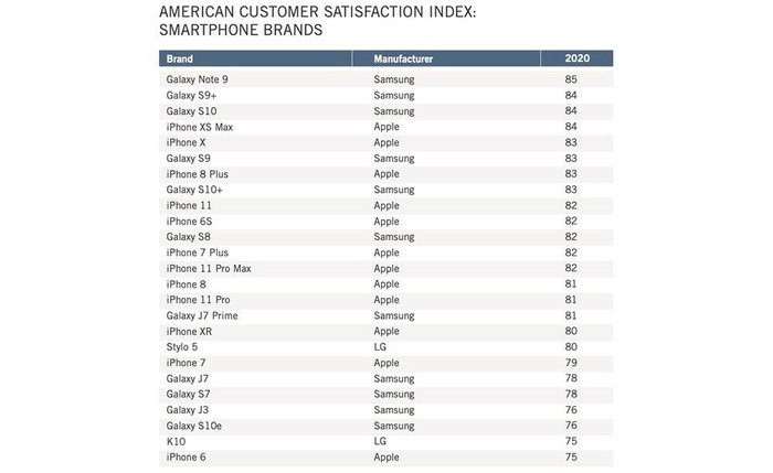Chiếc smartphone số 1 là Galaxy Note 9 của Samsung với số điểm trên bảng xếp hạng Chỉ số Hài lòng của Khách hàng Mỹ đạt 85%. Note 9 được đánh giá tốt nhất so với những chiếc điện thoại khác cả về những tính năng của điện thoại và chất lượng hình ảnh. Galaxy S9+ và S10 về thứ hai cùng với iPhone XS Max của Apple với số điểm là 84%. Các mẫu này đều là các mẫu cũ, được trình làng từ năm 2018, với ngoại lệ là S10. Tất cả 4 dòng điện thoại nói trên đều có màn hình từ 6,1 inch trở lên.