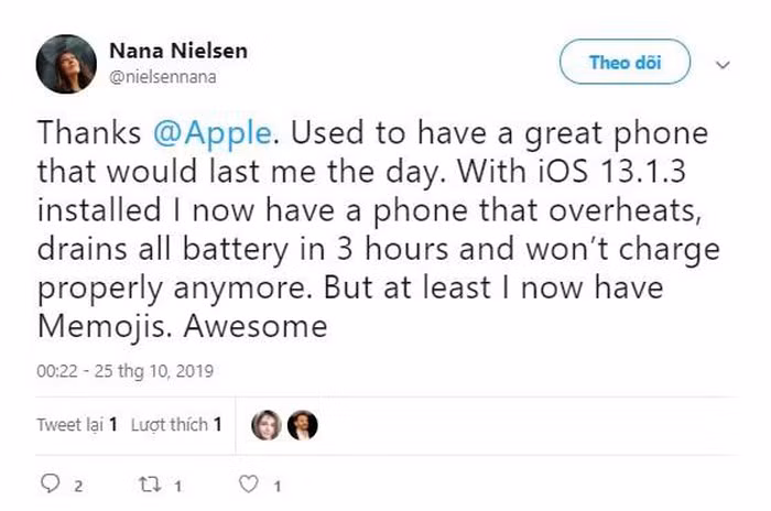 Trong khi đó, tài khoản Nana Nielsen cho biết sau khi chiếc iPhone của cô cập nhật lên iOS 13.1.3, máy nóng lên nhanh chóng, hết pin trong vòng 3 giờ và không thể sạc được.