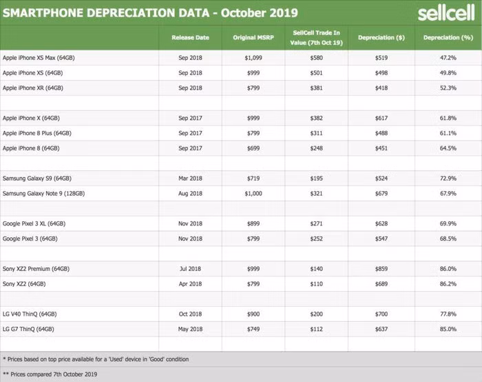 SellCell, website chuyên mua bán điện thoại cũ, sử dụng dữ liệu có được để đánh giá mức độ mất giá của iPhone, Galaxy, Sony, LG. Tương tự năm 2017, flagship 2018 của LG mất giá mạnh song tệ nhất lại là của Sony.