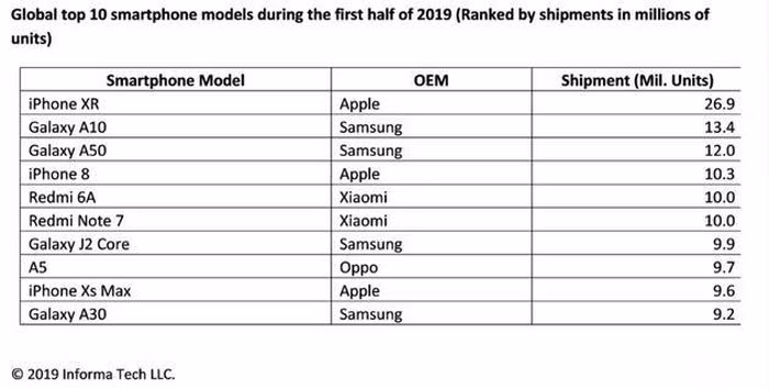 iPhone 8 ra mắt 2017 và XS Max cũng nằm trong top 10 smartphone bán chạy nhất nửa đầu 2019. Dòng Galaxy A giá rẻ của Samsung có đại diện là A10 và A50 – cả hai đều có giá dưới 400 USD (khoảng 9 triệu đồng), chiếm vị trí thứ 2 và 3 với doanh số lần lượt là 13,4 triệu và 12 triệu máy.