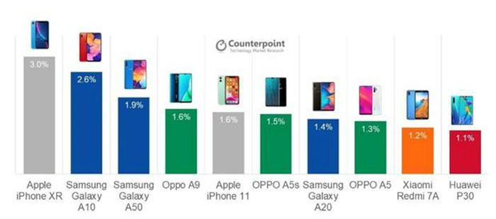 Samsung có ba mẫu điện thoại trong top 10, tất cả đều thuộc dòng A. Hãng công nghệ Hàn Quốc đã ngừng sản xuất dòng J của mình và đưa dòng A xuống mức giá thấp hơn.
