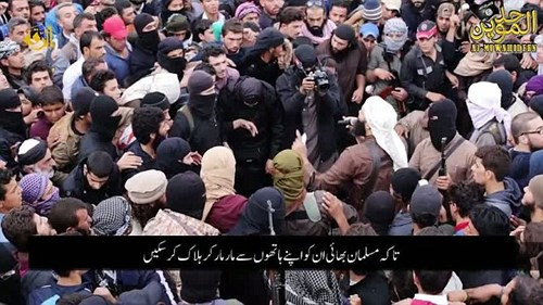 Ba tù nhân quỳ gối giữa vòng tròn đám đông và bất ngờ bị hàng chục người ùa vào đấm đá, dày xéo đến chết. Trong khi nhiều người ra sức tấn công thì một vài người giơ máy ảnh lên chụp. Sau cái chết đau đớn, thi thể đẫm máu của 3 con tin bị quân thánh chiến xích vào sau xe máy và kéo lê trên khắp đường phố Raqqa. Những chiến binh đi xe bấm còi inh ỏi, luôn miệng cười và giơ ngón tay thể hiện sự tôn sùng đạo giáo cực đoan dã man của chúng.