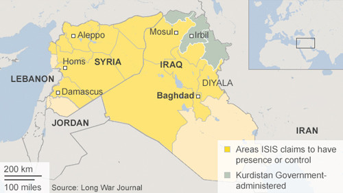 Những vùng lãnh thổ màu vàng nằm dưới sự kiểm soát của IS. Phần màu xám do người Kurd nắm giữ. Đồ họa: BBC