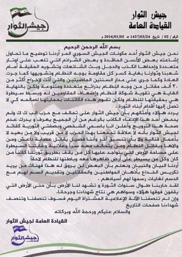 Lực lượng Jaysh al-Thuwar hình thành từ Lực lượng dân chủ Syria, là tổ chức liên minh cùng với Lực lượng Phòng vệ dân sự YPG và các tổ chức vũ trang của Quân đội Syria tự do cũng những lực lượng dân quân tự vệ khác. Bản tuyên bố đặc biệt này không thừa nhận YPG là một chi nhánh của lực lượng PKK và hai tổ chức này đang có những hoạt động liên kết hợp phối hợp với nhau.