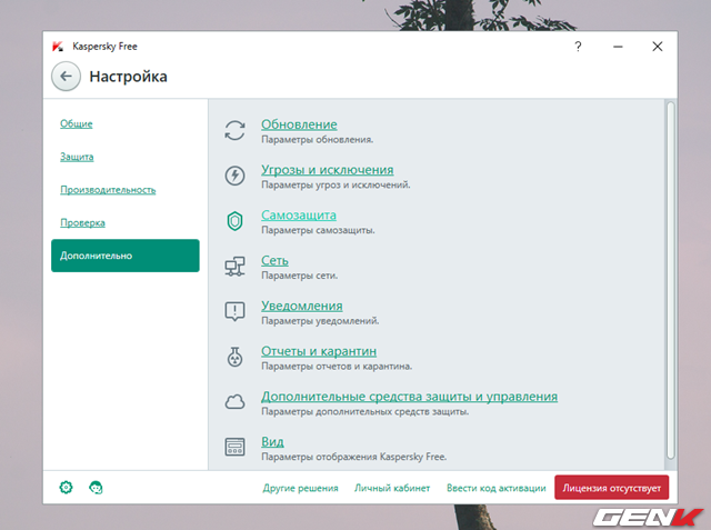 Khi đã xong, Kaspersky Free Antivirus sẽ tiến hành tối ưu lại dữ liệu cài đặt và giao diện Kaspersky Free Antivirus sẽ hiển thị. Do đã nói trước đó là hiện tại Kaspersky Free Antivirus chỉ mới được phát hành chính thức tại Nga và Ukraina nên ngôn ngữ mặc định sẽ là tiếng Nga. Mặc dù đã kiểm tra kĩ trong phần cài đặt nhưng bạn sẽ không thấy bất kỳ tùy chọn chuyển đổi ngôn ngữ sang tiếng Anh.