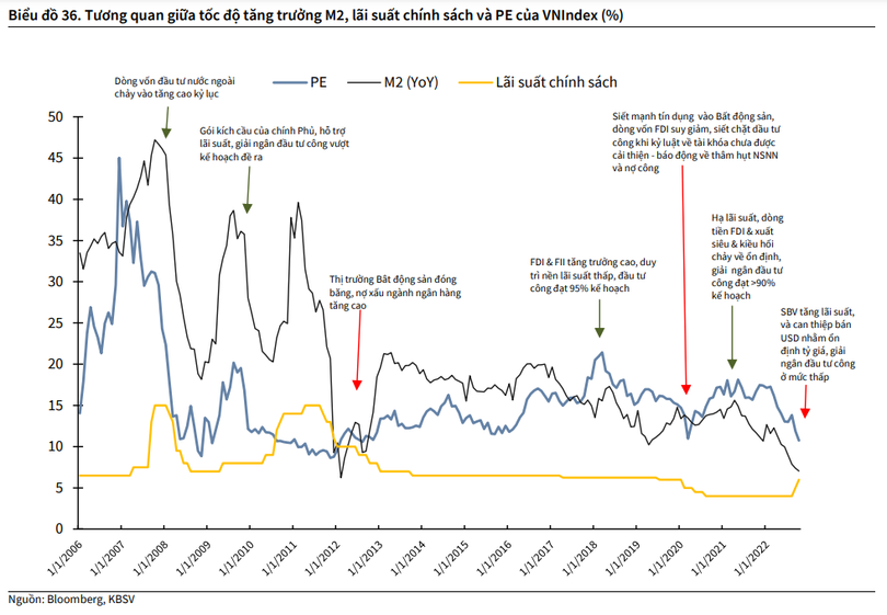 KBSV cho rằng cung tiền M2 là yếu tố có tác động mạnh lên diễn biến thị trường chứng khoán (TTCK). Các giai đoạn M2 tăng mạnh, đi kèm với mặt bằng lãi suất ở mức thấp và dòng tiền dồi dào chảy vào TTCK giúp VN-Index tăng điểm và ngược lại.