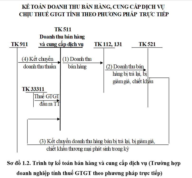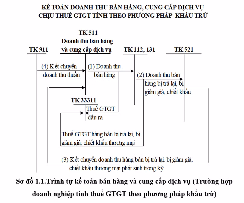 Trình tự kế toán bán hàng và cung cấp dịch vụ được sơ đồ hóa (sơ đồ chữ T) theo hai trường hợp: (1) Trường hợp doanh nghiệp tính thuế GTGT theo phương pháp khấu trừ; (2) Trường hợp doanh nghiệp tính thuế GTGT theo phương pháp trực tiếp.