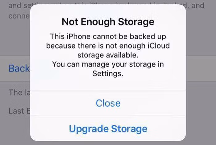Thông báo về việc không đủ dung lượng iCloud để sao lưu dữ liệu quen thuộc với người dùng iPhone. Ảnh: Tenorshare.