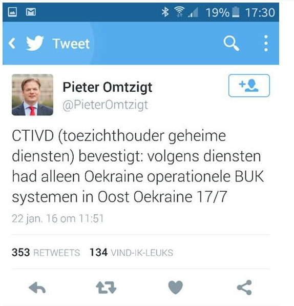 Thông tin này được khẳng đinh bởi đại biểu Quốc hội Hà Lan ông Pieter Omtzigt, đăng tải thông báo này trên tài khoản Twitter cá nhân vào ngày 22.01.16 hồi 11:51.