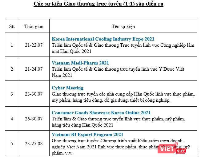 Để tiếp tục hỗ trợ, kết nối giao thương cho các doanh nghiệp Hàn Quốc và Việt Nam, trong tháng 7/2021, KOTRA phối hợp tổ chức chuỗi các sự kiện triển lãm, giao thương trực tuyến. Chuỗi sự kiện này bao gồm: Triển lãm và giao thương trực tuyến lĩnh vực phụ tùng ô tô tỉnh Ulsan; Giao thương trực tuyến với doanh nghiệp cung cấp Hàn Quốc tỉnh Jeonbuk lĩnh vực thực phẩm, mỹ phẩm, hàng tiêu dùng…;