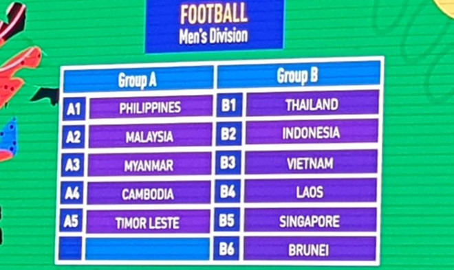 Kết quả bốc thăm là Việt Nam rơi vào bảng B gồm các đội Thái Lan, Indonesia, Singapore, Lào và Brunei. Trong khi đó, bảng A dễ thở hơn với các đội Malaysia, Myanmar, Philippines, Campuchia và Đông Timor.