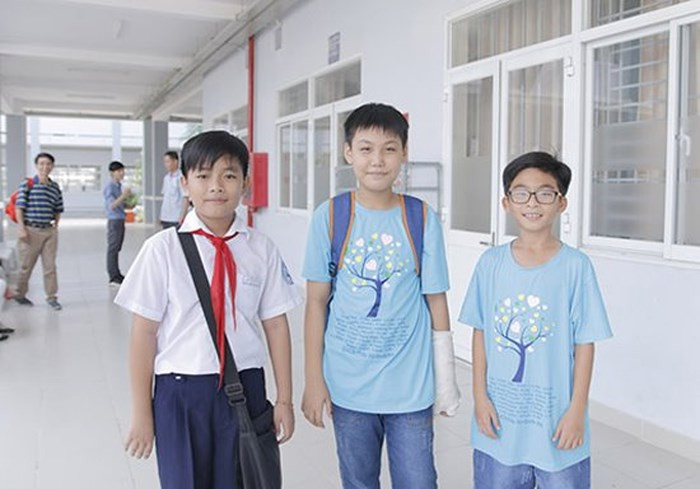 Học sinh Phạm Hoàng Vinh, trường Tiểu học Lạc Long Quân, TP.HCM (đứng giữa) vẫn cố gắng đến thi dù tay trái em bị thương.