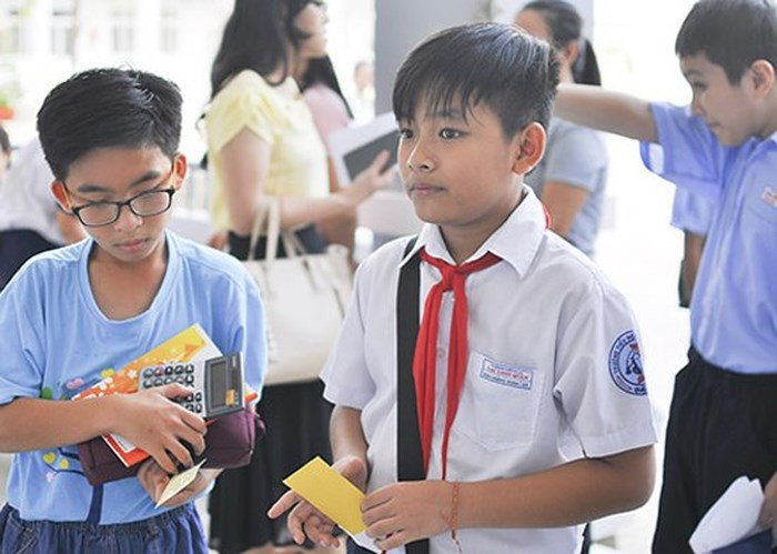 Học sinh chuẩn bị bước vào phòng thi tại trường Tiểu học Lạc Long Quân, Quận 1, TP.HCM.