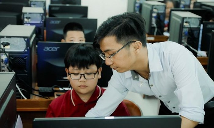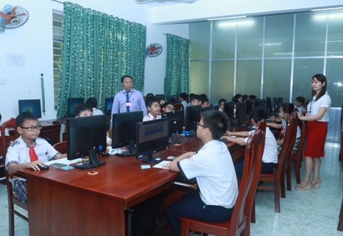 Thầy giáo hướng dẫn học sinh nhập mã trước khi bắt đầu làm bài thi vòng chung kết toàn quốc ViOlympic năm học 2017 - 2018.