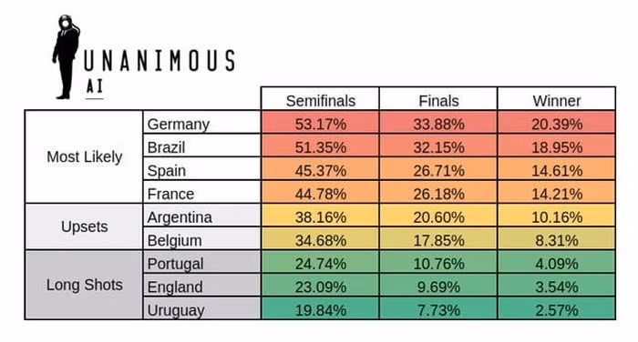 Đức sẽ đánh bại Brazil trong trận chung kết? Tây Ban Nha và Pháp sẽ gặp nhau ở các trận tứ kết? Tất cả tùy thuộc vào số lượng phiếu cược mà bạn đặt vào sức mạnh dự báo của A.I.