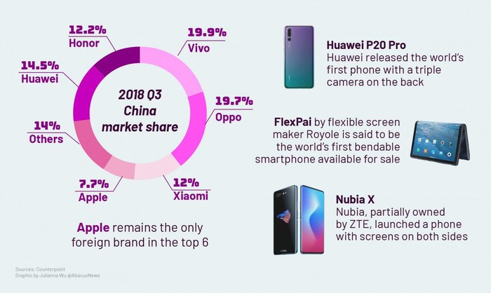 Theo thống kê từ Counterpoint, tính đến quý III/2018, 5 nhà sản xuất smartphone chiếm thị phần lớn nhất tại Trung Quốc đều là các thương hiệu Android nội địa gồm Vivo, Oppo, Huawei, Honor và Xiaomi.