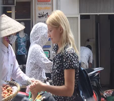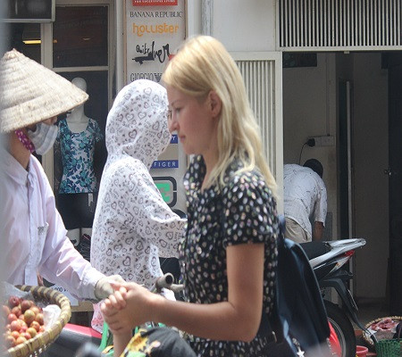 Trong khi các cô gái Việt đều trang bị kín thân bằng quần áo chống nắng, nhưng các cô gái phương Tây lại để đầu trần, áo ngắn tay mặc dù trời rất nắng.