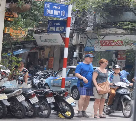 Hai vị khách này đang kiên nhẫn dưới nắng nóng chờ qua đường tại khu vực phố cổ Hà Nội.