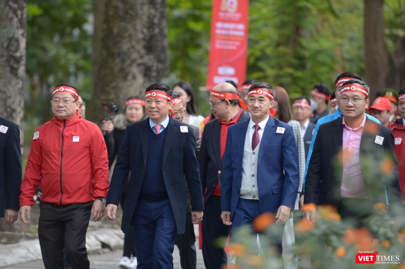 | Đại diện Ban Tuyên giáo Trung ương, Bộ Y tế, Trung ương Đoàn TNCS HCM, Ủy ban An toàn giao thông Quốc gia và đông đảo người dân, sinh viên các trường đại học tham gia diễu hành cổ động Chủ nhật Đỏ. |