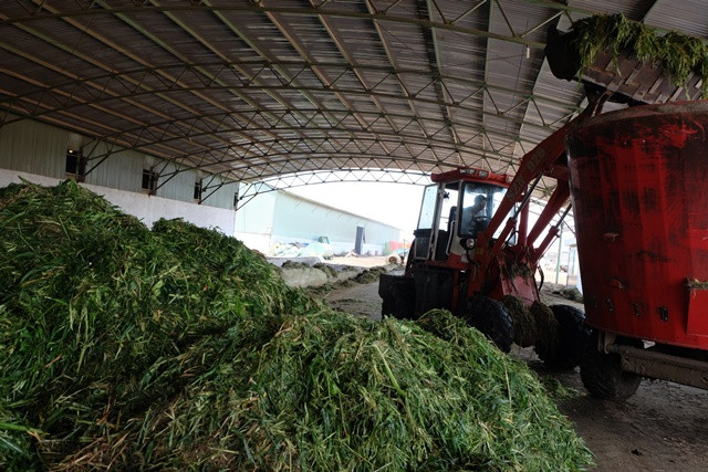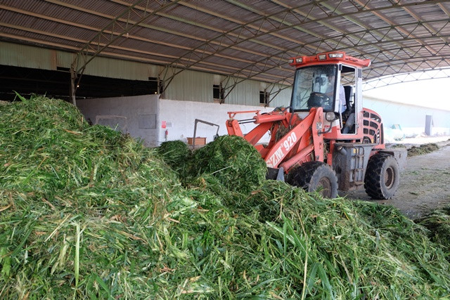 Thức ăn sau khi được trộn đưa đến từng chuồng bò. Một chiếc xe máy xúc được 1 công nhân vận hành có thể phục vụ 1000 con bò một ngày, với tất cả các công đoạn.