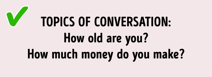 Nói về tuổi tác hoặc số tiền mà bạn kiếm được là cả hai chủ đề hoàn toàn bình thường cho một cuộc trò chuyện lịch sự của người Việt Nam. Người dân tin rằng những chủ đề này có thể làm cuộc trò chuyện sinh động và cho thấy rằng người đối diện quan tâm đến bạn và cuộc sống của bạn.