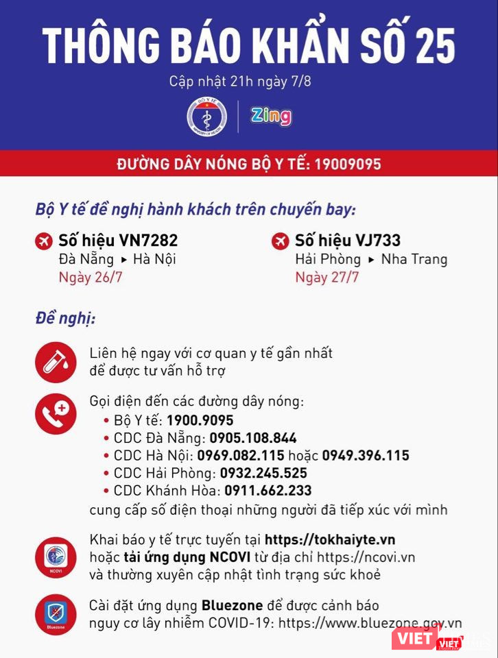 Thứ hai, người đi trên chuyến bay này cần gọi điện đến các đường dây nóng của Bộ Y tế (1900.9095), CDC Đà Nẵng (0905.108844), CDC Hà Nội (0969.812.115 / 0949.396.115), CDC Khánh Hòa (0911.662.2323) hoặc CDC Hải Phòng (0932.245.525) để cung cấp số điện thoại những người đã tiếp xúc với mình.